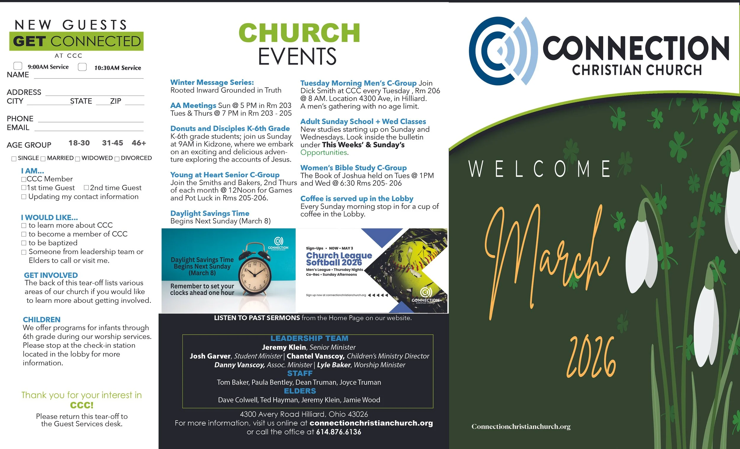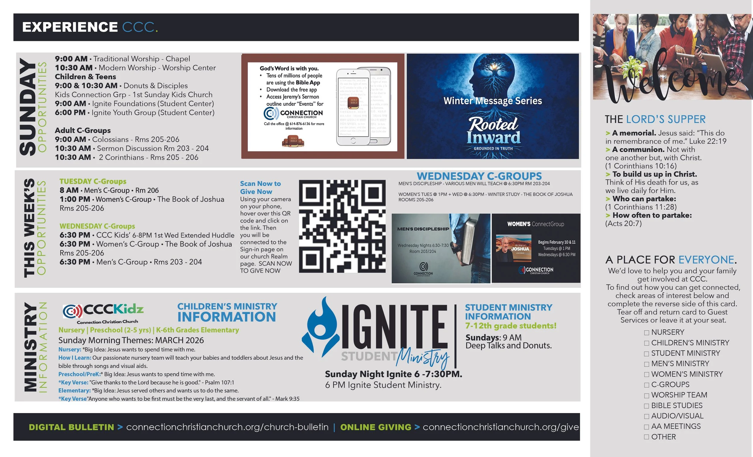 Thank you for viewing our online bulletin! New information is created monthly with occasional updates week to week. Weekly inserts and sermon notes are found within our printed copies available at both morning services. Click images below to view or enlarge digitally.
